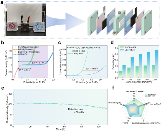 结果显示,该催化剂在EGOR中表现出卓越性能:仅需0.68 V(vs RHE)即可达到100 mA cm⁻2的电流密度,相较传统OER反应能耗降低60.1%。更值得关注的是,在1.0 V(vs RHE)、600 mA cm⁻²的工业级条件下,其生成高附加值GA的法拉第效率仍保持96.6%,选择性达93.5%,突破了现有催化体系的性能瓶颈。在流动池中展现出优异的双功能产出能力:在200 mA cm⁻2电流密度下,可同时将PET水解液转化为GA(产率0.0299 mmol min⁻1),并从天然海水中制备氢气(产率1.531 mL min⁻1)。长期稳定性测试表明,该系统在100 mA cm⁻2下连续运行120小时,性能衰减不足12%,且整体能耗较传统海水电解制氢降低51.3%。