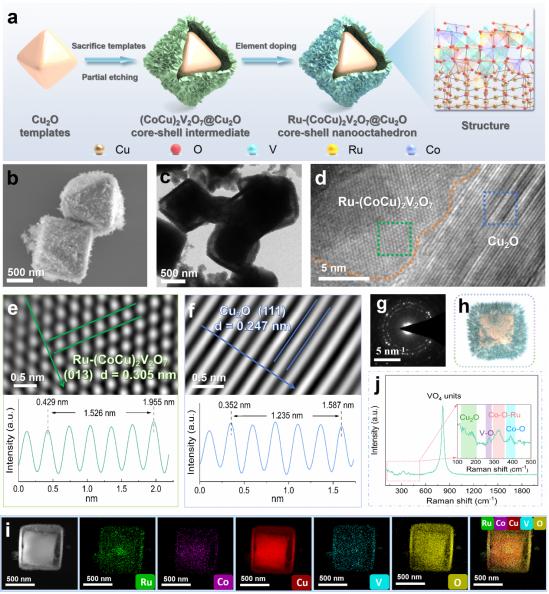基于此,研究团队将亲氧过渡金属与贵金属结合,设计了一种富含Co–O–Ru不对称活性中心的Ru-(CoCu)2V2O7@Cu2O电催化剂,从而触发动态电子离域。这打破了EG分子的对称性,使得关键中间体(*OCCH2OH和*OH)被靶向吸附,实现了单一羟甲基的定向去质子化。同时,利用电子离域特性调控反应路径,突破单一羟甲基的选择性氧化,并及时解吸C2产物使贵金属活性位周期性恢复,避免深度氧化,提高GA选择性。