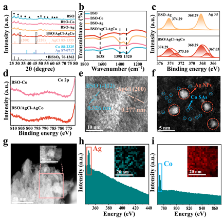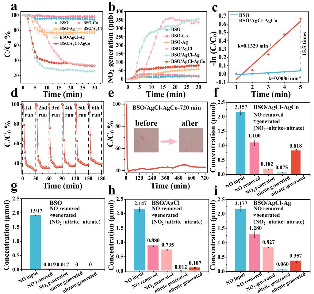 研究团队通过精准的催化剂结构设计,构建了BiSbO₄/AgCl-AgCo多组分光催化体系。该体系具有多重结构优势:其一,BiSbO₄AgCl形成的异质结可构建内建电场,有效促进光生电荷定向分离与传输;其二,引入银纳米颗粒(Ag NPs可通过表面等离子体共振效应,显著增强催化剂对可见光吸收的吸收能力;其三,原子级分散的钴单原子(Co SAs)作为高效活化中心,能够精准调控催化反应路径。实验结果表明,该催化剂在可见光照射 NO去除效率可达67.0%NO₂生成量抑制在80 ppb,远优于未修饰的BiSbO4/AgCl335 ppb)和BiSbO₄/AgCl-Ag329 ppb催化剂。此外,稳定性测试显示,该催化剂连续运行720分钟后仍保持57%催化活性,并在经过六次循环后效率仅下降6.4%展示优异的长期稳定性与循环使用性能