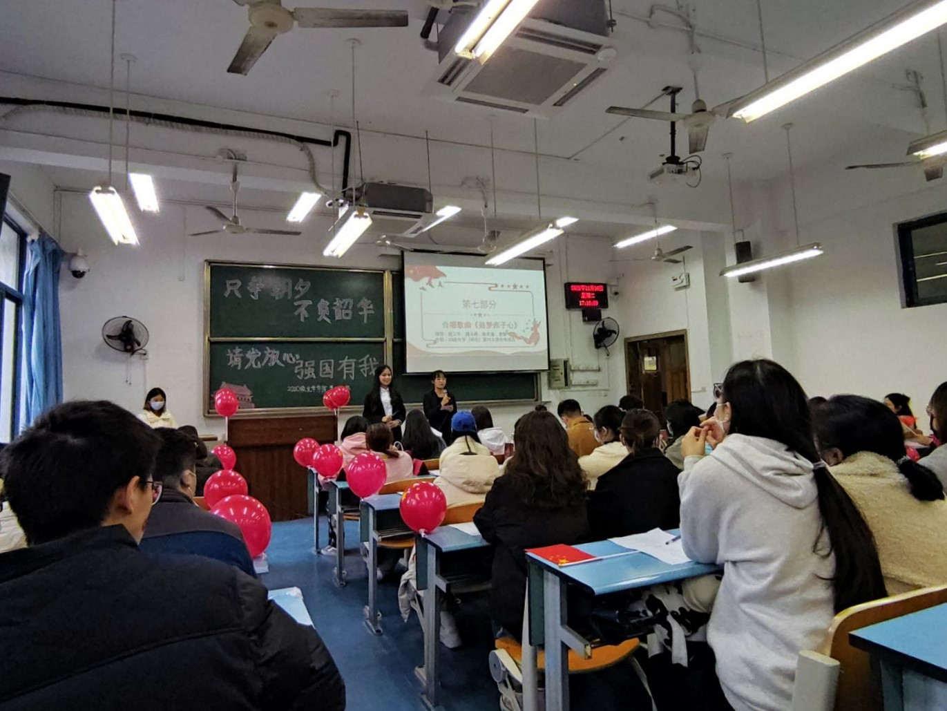 活动伊始,主持人首先介绍了此次团日活动的背景和意义,以增强同学们对本次团日活动主题的理解。在主持人介绍完后,本次团日活动正式开始。一支优美的舞蹈《万寿无疆》表达了对祖国的无限热爱;两位同学分享的优秀青年——秦玥飞和申怡飞扎根基层的故事,使同学们深刻认识到要把自己的人生理想与祖国、时代相联系,树立远大的标,培养良好品德,发扬创新精神,掌握实践能力,成为新世纪的社会主义事业建设者;诗歌朗诵《少年中国说》,更让同学们感受到虽纵有千古,横有八荒,但我们青年一代前途似海,来日方长。