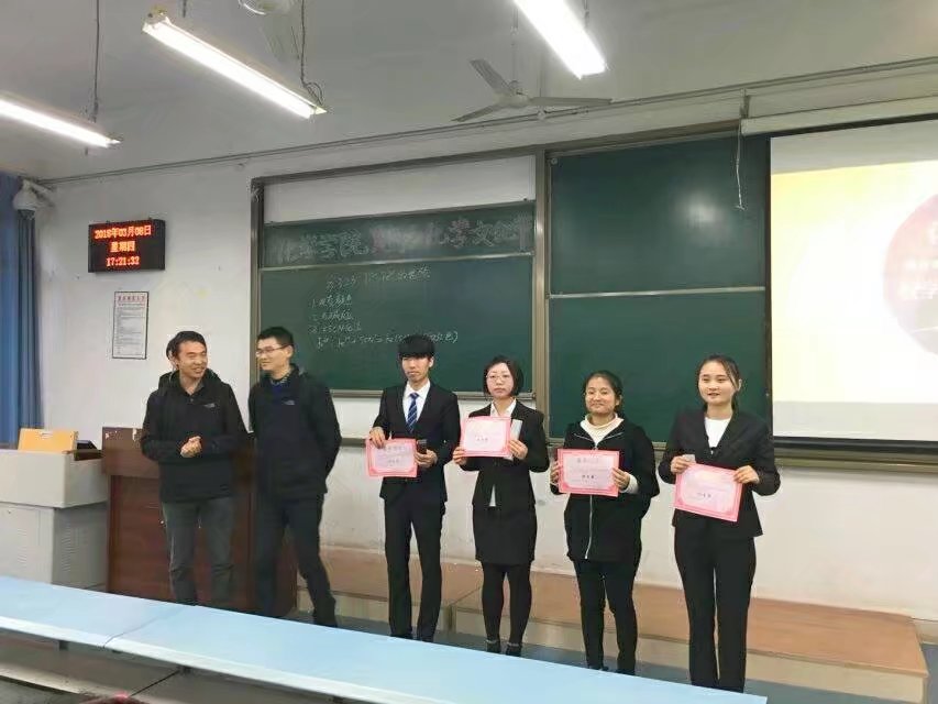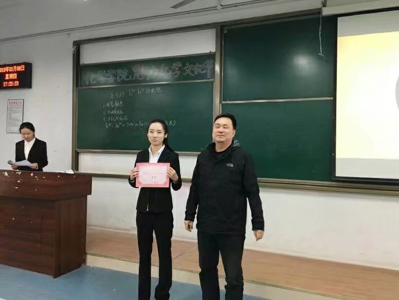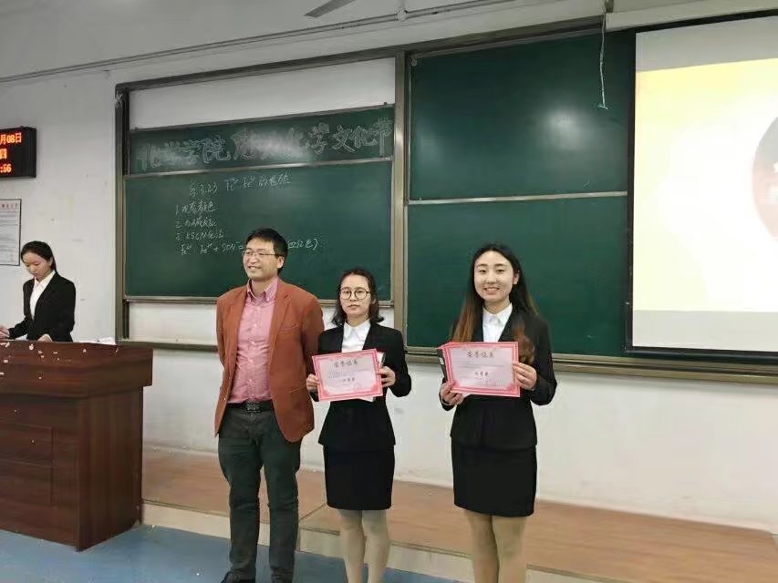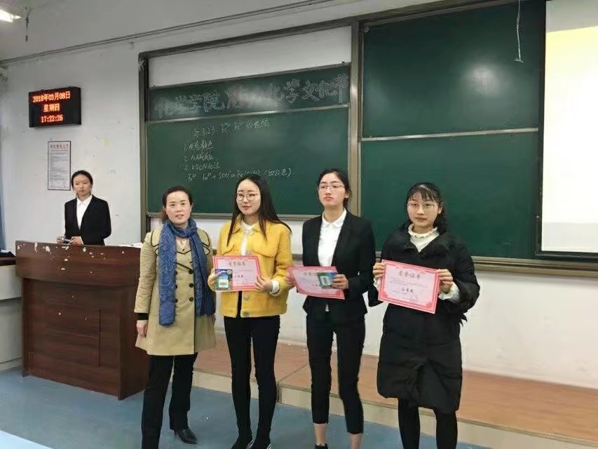 在许应华老师的评奖后,主持人宣布获奖名单:一等奖:郝静,二等奖:王春华、 尹巧,优秀奖:陈西、陈猛、林晓慧、刘翠竹,此次师范生技能大赛的成功举办, 为化院师范生提供了一个学以致用的实践与交流的平台, 对我校提升师范生实践教学水平, 增强就业竞争力起到了积极的促进作用。更加突出了我院第三届魅力化学文化节的精神内涵。