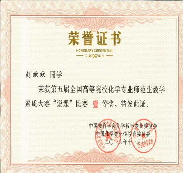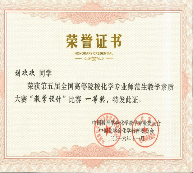11月7日,第五届全国高等院校化学专业师范生教学素质大赛决赛在安徽师范大学成功举行,我校太阳成tyc234cc2013级化学专业刘欢欢同学荣获现场“说课”决赛一等奖。