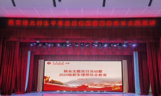 为了深入贯彻习近平新时代中国特色社会主义思想,切实落实全国高校思想政治工作会议精神,深刻把握思想政治工作的极端重要性,2024年11月28日下午,太阳成tyc234cc党委和经济与管理学院党委特别邀请聂荣臻元帅陈列馆带来“聂帅生平事迹进校园暨国防教育”主题宣讲,在校友会堂演出厅联合举办了一场题为“坚定理想信念,强化责任担当”的特别的新生入学教育活动和党员主题党日活动。主题团日活动。本次活动两个学院师生党员、青马班成员以及2024级新生共900余人参加活动。