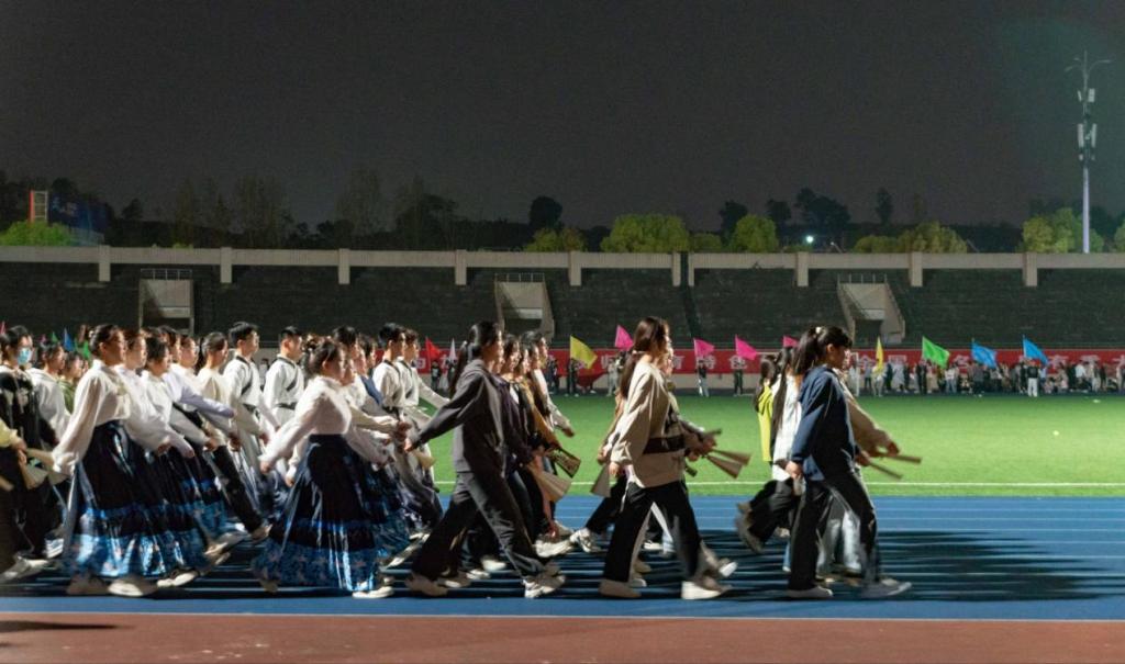 欣赏完振奋人心的霍元甲扇子舞和惟妙惟肖的古风舞蹈,这一刻,开幕式排练现场的氛围被推向了高潮,整个运动场都洋溢着青春向上的气息。