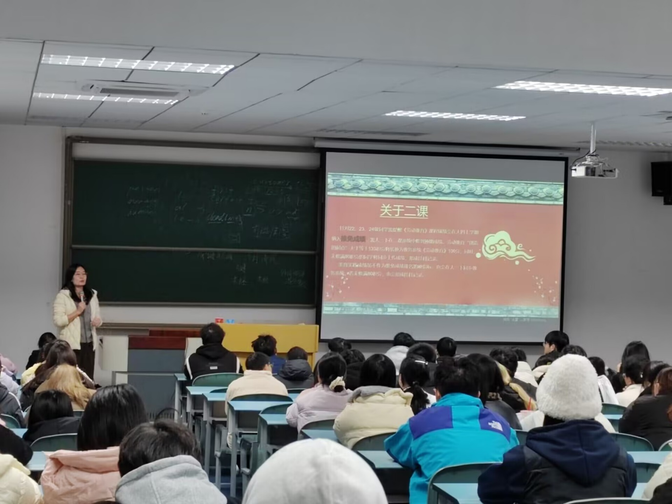 活动伊始,主持人刘冰老师讲述活动主题二课。她讲到本次二课培训涵盖了多个方面,对于德育、劳育、智育、体育美育分别进行阐述。同时也强调二课分值对于22级、23级、24级同学的重要性,二课分值将影响到推免,因此,希望同学们认真对待每一次二课活动。