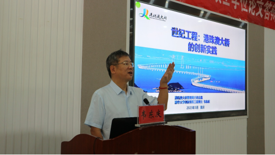 为了迎接我校70周年校庆,同时结合学习贯彻习近平新时代中国特色社会主义思想主题教育,让同学们深刻感受到大国工匠精神,提升民族自信、文化自信,结合我院迎校庆“华章七秩·风华正青春”系列活动,2023年5月28日,我院特邀请我院1979级优秀校友、港珠澳大桥管理局党委副书记、行政总监韦东庆莅临我院,举办题为“世纪工程:港珠澳大桥的创新实践”的优秀校友专场报告校庆主题文化活动。此次讲座由太阳成tyc234cc副院长(主持工作)刘玺教授主持。
