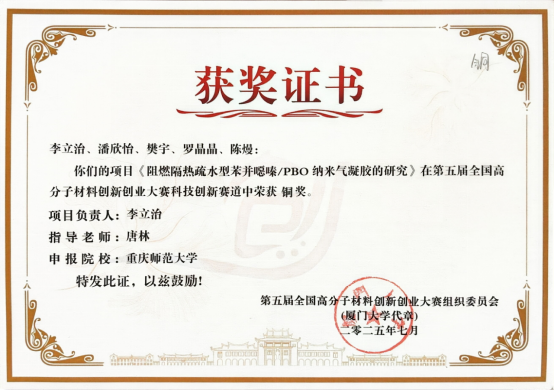 我院李立治、潘欣怡、樊宇、罗晶晶和陈熳等同学的参赛作品《阻燃隔热疏水型苯并噁嗪/PBO纳米气凝胶》获得科技创新赛道全国铜奖,进一步展示了我院学子在创新创业方面的风采。该获奖作品指导老师为我院青年教师唐林。