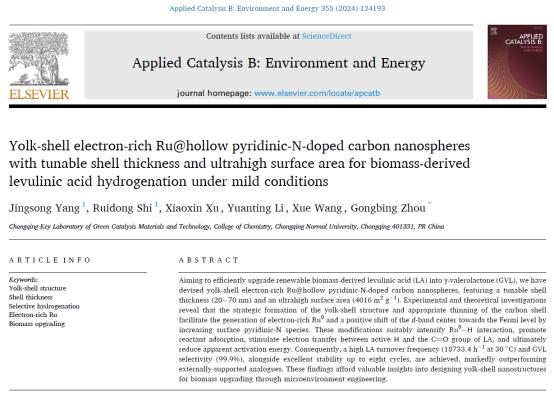 近日,我院在生物质升级转化领域取得重要进展,相关成果以《Yolk-shell electron-rich Ru@hollow pyridinic-N-doped carbon nanospheres with tunable shell thickness and ultrahigh surface area for biomass-derived levulinic acid hydrogenation under mild conditions》为题在线发表于催化领域国际顶级学术期刊《Applied Catalysis B: Environment and Energy》(中科院大类一区TOP期刊,影响因子22.1),我院研究生杨京嵩为第一作者,周功兵教授为唯一通讯作者,我校为唯一署名单位。