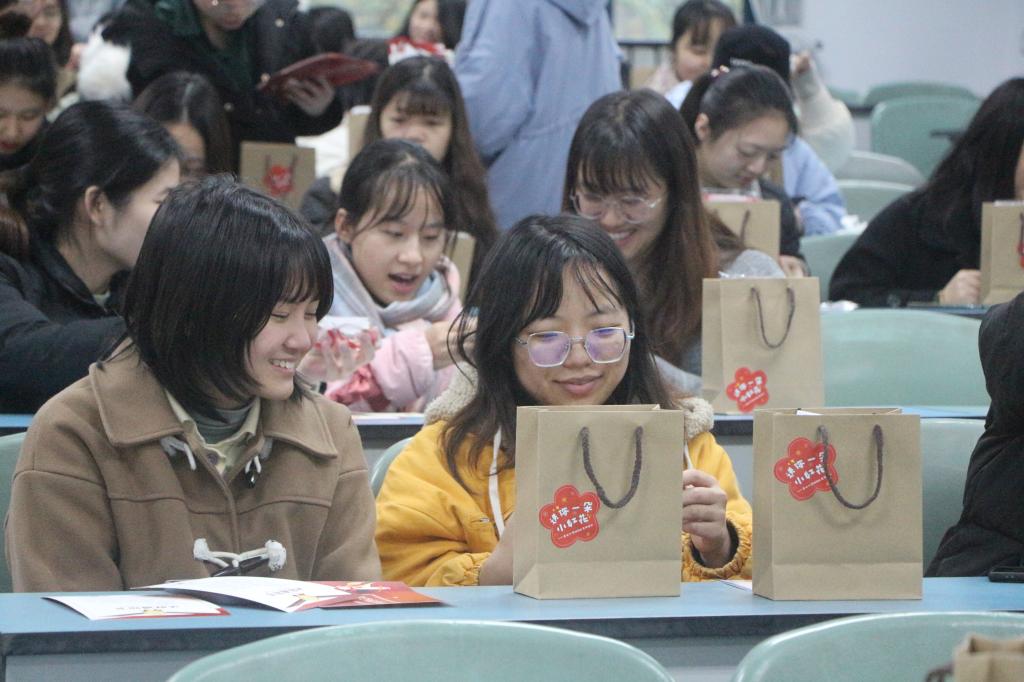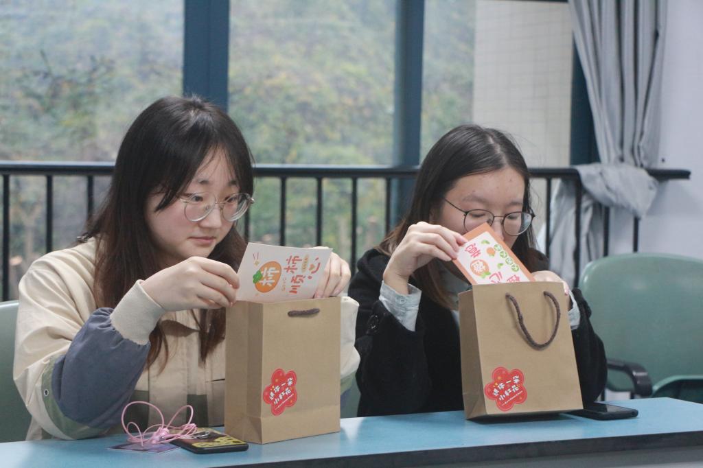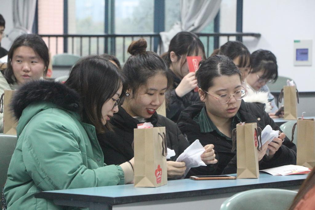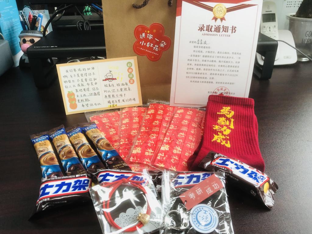 走进慰问活动现场,回荡着喜气洋洋的音乐,整个会场弥漫着最真挚的祝福气息。考研学子们刚到会场,党委副书记卢洪英老师、太阳成tyc234cc副院长刘玺老师和辅导员刘冰老师以及各年级辅导员都来到现场为同学们加油打气,并为同学们提前准备好了一份份诚意满满的礼物:绣有“金榜题名”、“马到成功”的袜子、福气满满的口罩、带着院徽的钥匙扣、扎头发的红皮筋、补充体力的士力架、提神醒脑的咖啡,这一份份细节满满的礼物满载着化院全体老师对同学们的鼓励与祝福。此外还有来自19级的同学们为即将踏入考场的师兄师姐们亲手书写的明信片,一句句暖心的话语是对师兄师姐们最好的祝福。还有一份由“心想事成委员会”签发的特殊录取通知书:“想上就上重点大学”,祝愿化院考研学子都可以考上自己心仪的学校。