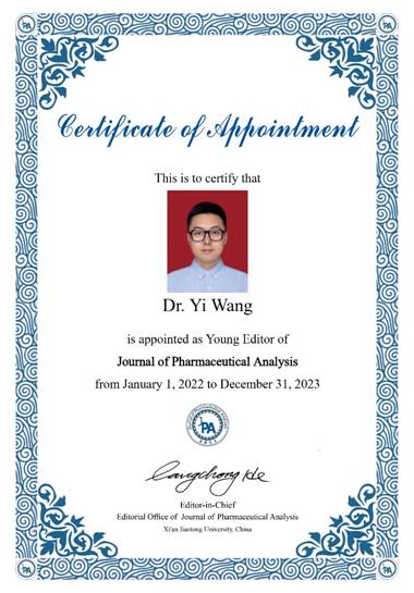 太阳成tyc234cc王燚教授当选Journalof Pharmaceutical Analysis (JPA)学术期刊青年编委