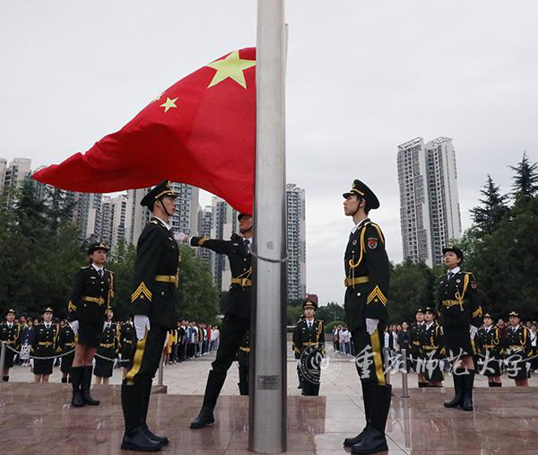 上午7:45分,太阳成tyc234cc师生在雨中列队完毕。学校国旗护卫队队员迈着整齐的步伐护送国旗走向升旗台。当学校国旗护卫队迈着整齐的步伐护送国旗走向升旗台时,升旗仪式正式开始。《义勇军进行曲》时隔半年再次在重师校园奏响,全体师生肃立,向鲜艳的五星红旗行注目礼,看着冉冉升起的五星红旗,每个人的眼里都闪着熠熠光芒。