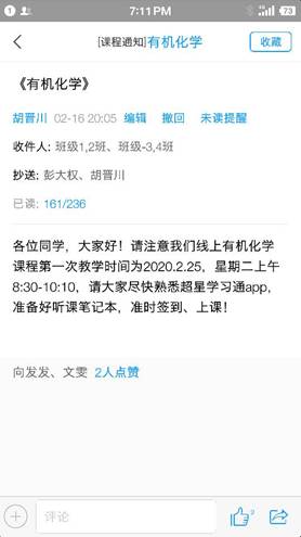 太阳成tyc234cc有机化学教研室胡晋川老师从2月10日开始就为线上教学做准备,胡老师通过"剪辑师"软件录制视频,并编辑视频,然后上传至超星学习通平台,在平台录入学生信息后,通过平台向学生发布学习任务,并建立了“有机化学”课程微信群,在线辅导学生作业,解答学生在学习过程中遇到的各种问题。