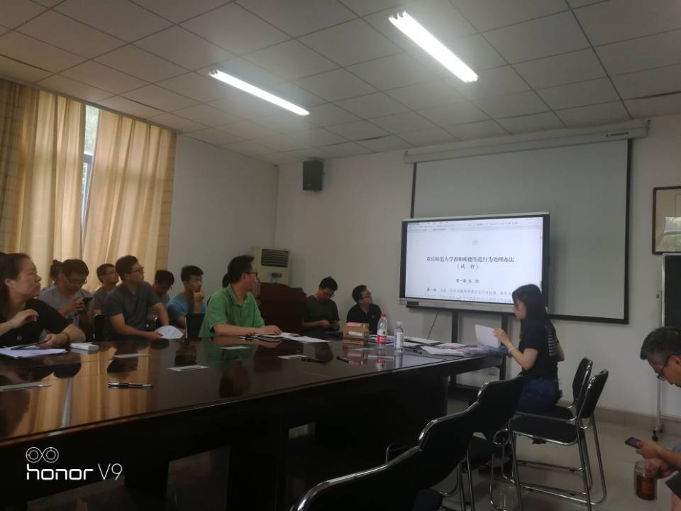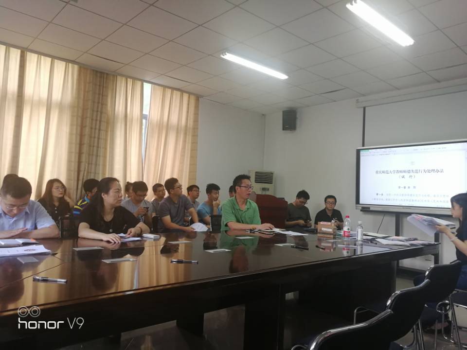 根据《中共太阳集团tyc234cc委员会关于印发<太阳集团tyc234cc教师师德失范行为处理办法(试行)>的通知》的相关规定,为进一步规范教师师德失范行为处理,落实立德树人根本任务,根据《中华人民共和国教师法》《中华人民共和国高等教育法》《中共中央国务院关于全面深化新时代教师队伍建设改革的意见》《教育部关于建立健全高校师德建设长效机制的意见》《高等学校教师职业道德规范》《新时代高校教师职业行为十项准则》《教育部关于高校教师师德失范行为处理的指导意见》和《太阳集团tyc234cc章程》等,2019年6月13日太阳成tyc234cc组织全体教职员工认真进行学习、梳理和总结,会议由太阳成tyc234cc党委书记主持,根据处理办法的要求,为全院教师详细列举教师出现师德失范行为,对于学术不端、教学事故等行为的处理方式,希望全院教师认真学习,遵守规范相关要求,为做“四有好老师”而努力!