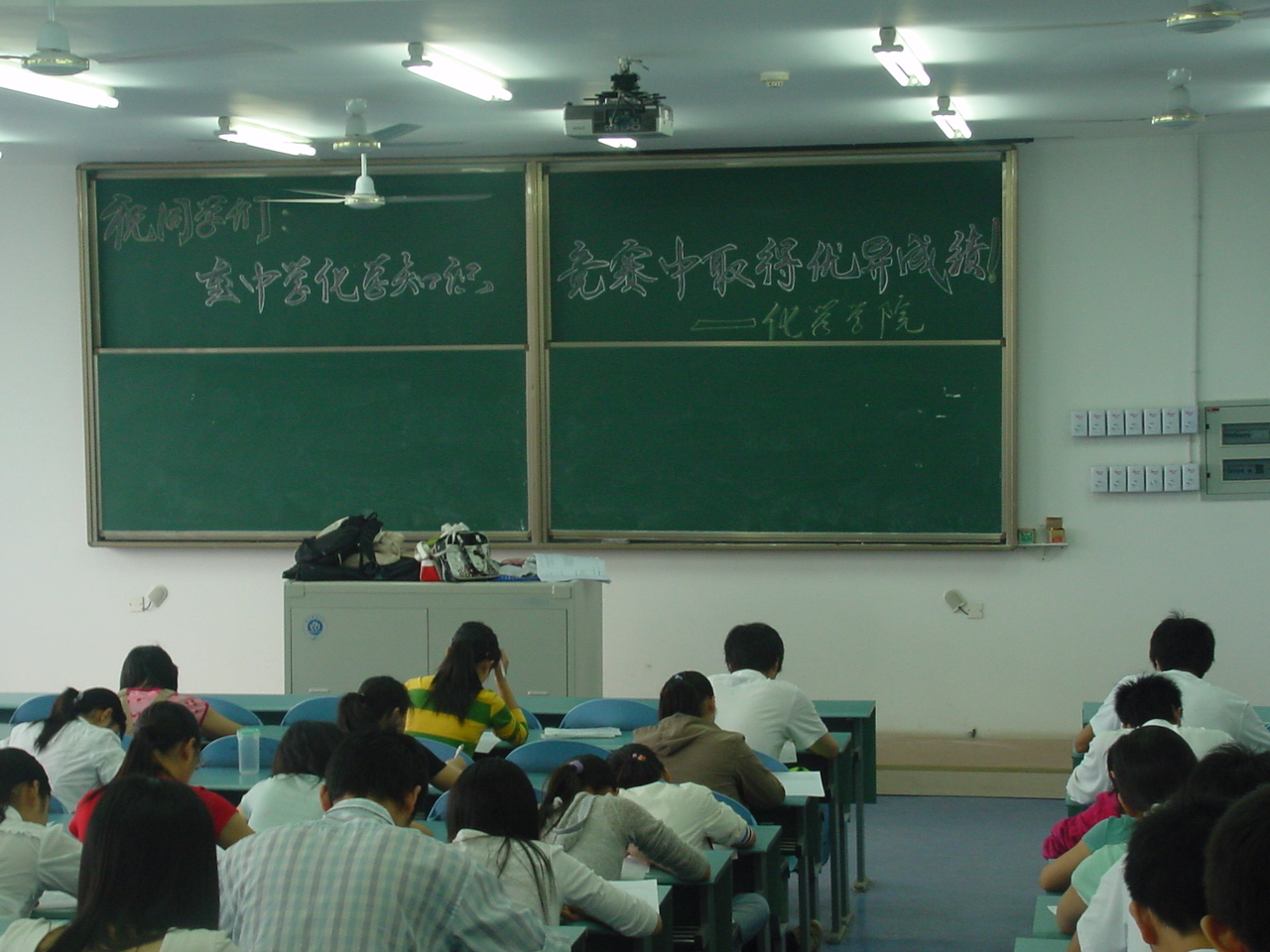 2008年5月31日上午8:30,太阳成tyc234cc“中学化学知识竞赛”在老校区和大学城校区同时举行,05级、06级和07级化学(师范)专业的全体同学参加了本次竞赛;竞赛现场中,同学们态度端正,积极思考,认真答好每一道题;竞赛取得圆满成功。今后,我院将坚持举办类似的竞赛,以提高同学们的专业技能,为同学们“大四”实习和日后走上工作岗位打下坚实的基础。