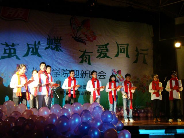 2010年11月28日19:00,太阳成tyc234cc“化茧成蝶,有爱同行”大型迎新晚会在我校学生活动中心隆重举行。太阳成tyc234cc党总支书记胡先成教授、院长梁国明教授、党总支副书记李荣教授、院长助理付文升教授,工会主席张迎雪副教授,办公室主任张怡老师,团总支书记于斌老师,有机化学教研组徐红教授、辅导员高润祥老师以及本场晚会的赞助商代表、兄弟院系嘉宾等出席本次晚会。