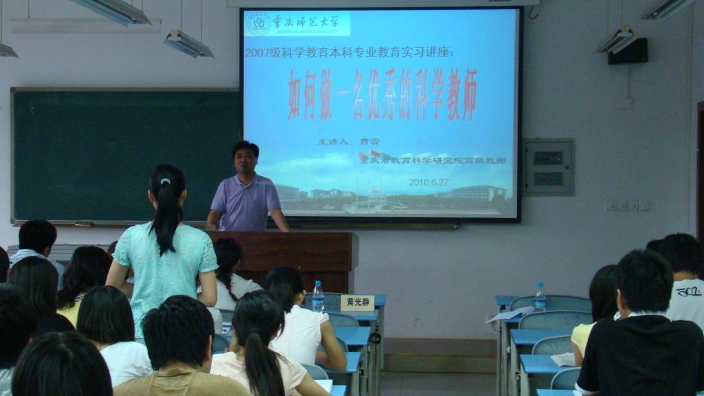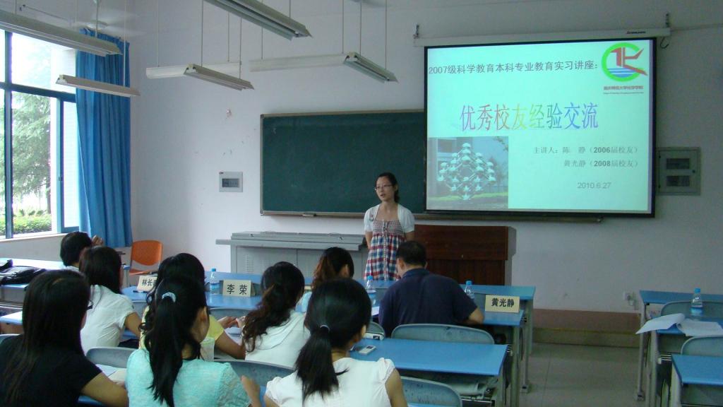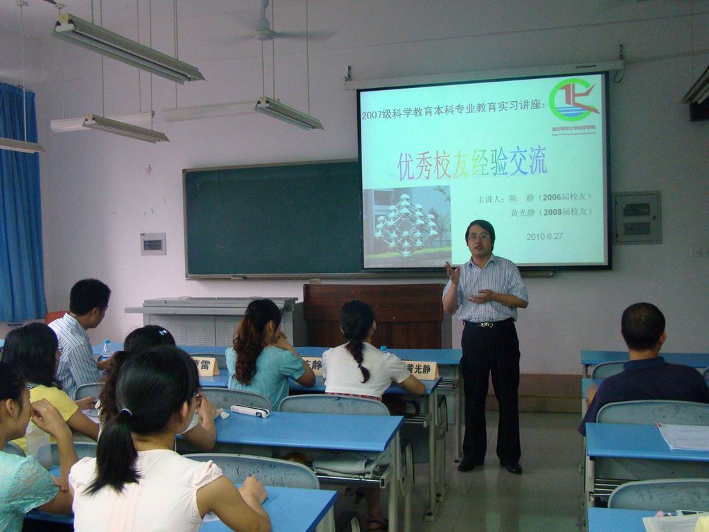 为了帮助我院2007级科学教育专业的同学们更好地准备教育实习, 2010年6月27日上午9:00,太阳成tyc234cc在13101教室特意举办了一场教育实习讲座。讲座邀请了重庆市教育科学研究院高级教师曹雷老师以及我院06、08届科学教育本科专业优秀毕业生陈静和黄光静做主讲嘉宾,本次讲座由科学教育本科专业负责人林长春教授担任主持,我院党总支副书记李荣教授、辅导员高润祥老师也参加了此次讲座。