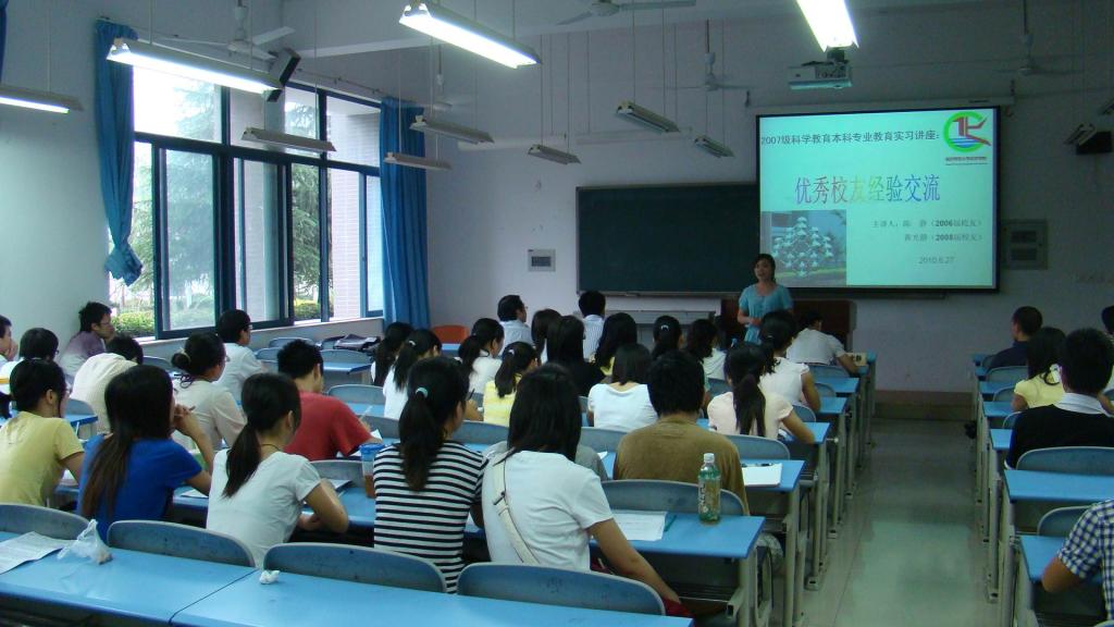 首先,陈静和黄光静两位学姐从自身的教学成长经历与同学们做了深入的交流,两位老师向即将进行教育实习的学弟学妹们传授了“五多”即 “多做、多看、多想、多写、多问”的教学习惯,并就教学过程中遇到的许多实际问题向大家做了详细的解答,她们认为要上好一堂优质的科学课,平时要做到博览群书,做到多积累,勤动脑;上课前要充分备课,对上课涉及到的实验要做好事先的演练。