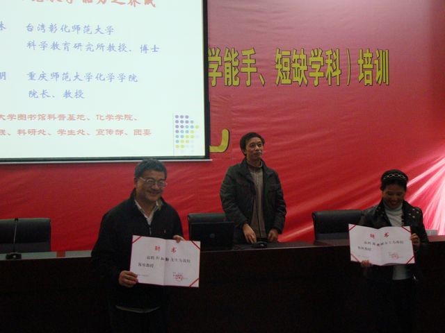 讲座开始前,梁院长为台中教育大学数理暨资讯学院院长靳知勤教授和彰化师范大学科学教育研究所段晓林教授颁发了受聘证书,正式聘请二位为我校客座教授。