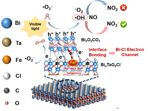 氮氧化物(NOx)是大气污染的“元凶”之一,其中一氧化氮(NO)的净化一直是环保领域的难题。传统技术难以实现高效且选择性地将NO转化,还容易在净化过程中产生毒性更强的二氧化氮(NO₂),进一步加剧空气污染,危害人体健康。我校太阳成tyc234cc的科研团队成功研发出一种新型复合光催化剂Bi4TaO8Cl/Bi2O2CO3-Fe。他们巧妙地构建了异质结,并引入Fe³⁺作为电子受体中心,为解决NO净化难题提供了创新方案。该研究发现,Fe³⁺在光催化过程中具有“双重身份”。一方面,它能够增强界面电子转移,让光生载流子的分离效率大幅提升;另一方面,Fe³⁺可以激活表面位点的H₂O,促使具有强氧化性的羟基自由基(・OH)生成。并且,优化后的异质结光催化剂,NO转化率高达68.19%,而NO₂选择性却低至10.98%,能有效抑制NO₂的产生,将NO高效转化为稳定的硝酸盐(NO₃⁻)。电子自旋共振(ESR)和活性氧物种(ROS)猝灭实验表明,Fe³⁺驱动的电子迁移使表面空穴富集,H₂O吸附量增加,・OH生成量提升了2.76倍。强大的氧化能力使得・OH在光催化NO氧化过程中,能够有效抑制NO₂的生成,推动NO完全氧化为NO₃⁻。这项研究成果为选择性去除NO提供了新的策略,为设计环保型光催化剂提供了关键思路,在大气污染治理领域具有广阔的应用前景。未来,随着该技术的进一步发展和应用,有望为改善空气质量、打赢蓝天保卫战贡献重要力量。