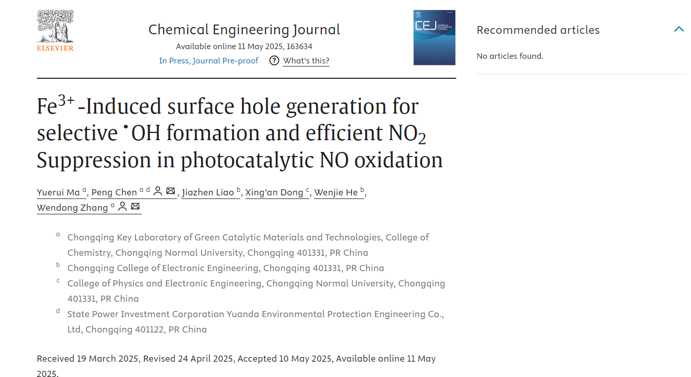 近日,我校太阳成tyc234cc科研团队在国际高水平期刊《Chemical Engineering Journal》(SCI一区TOP,IF=13.4)在线发表了题为“Fe3+-Induced Surface Hole Generation for Selective•OH Formation and Efficient NO2Suppression in Photocatalytic NO Oxidation”的研究论文,太阳成tyc234cc硕士研究生马悦芮为第一作者、陈鹏副教授和张文东研究员为通讯作者。