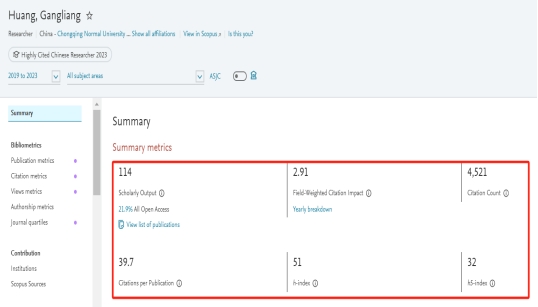 最近5年共发表国际可见文章114篇,总被引4,521次,片均被引39.7次。归一化引用影响力指标(FWCI)为2.91。同期太阳集团tyc234cc的归一化引用影响力指标为1.16。
